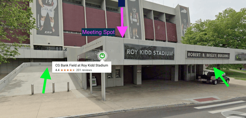We meet at the top of the ramp in front of the stadium.